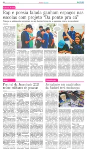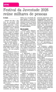 Na mídia: Festival da Juventude 2026 reúne milhares de pessoas 15/04/2026 Foram 27.505 pessoas de público em um dos principais eventos culturais voltados à juventude em Mato Grosso do Sul Clique nas imagens abaixo para ver/ler o material: